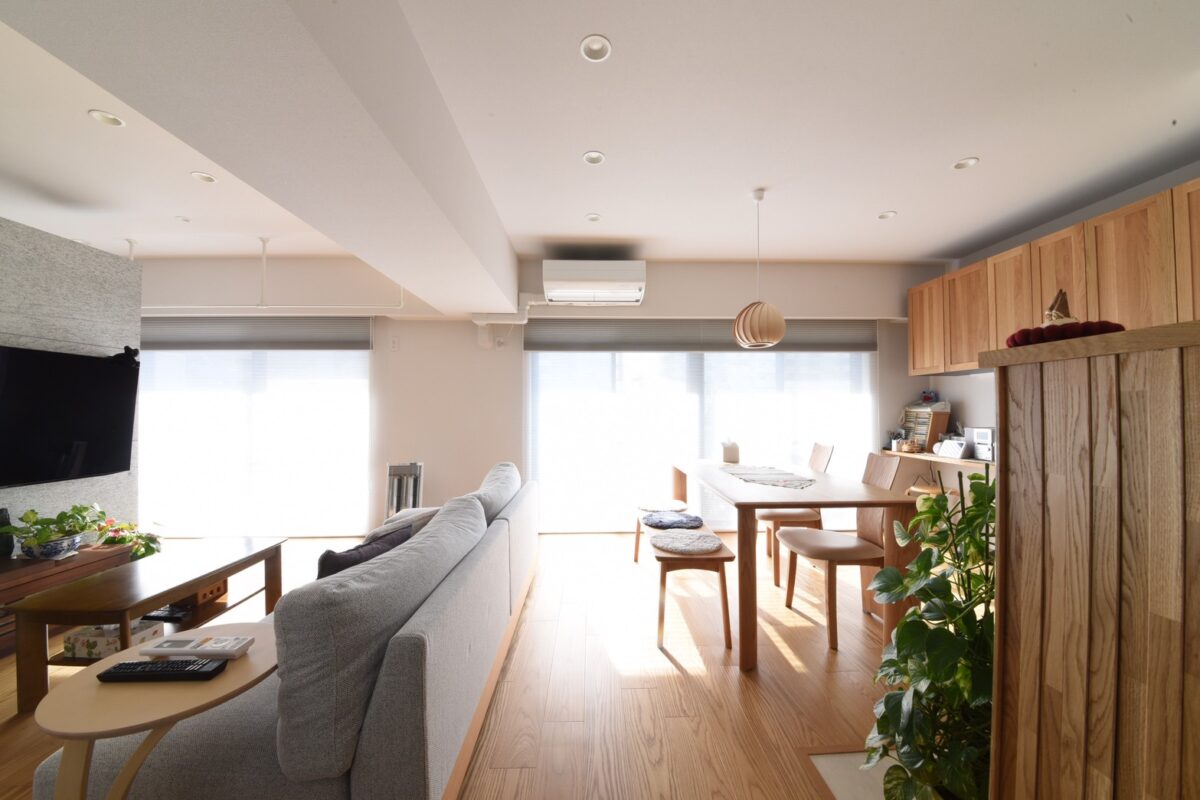 色のトーンを合わせ、赤みのない木材(パナソニックのグレージュオーク柄など)を選ぶ。 - 造作・家具の工夫