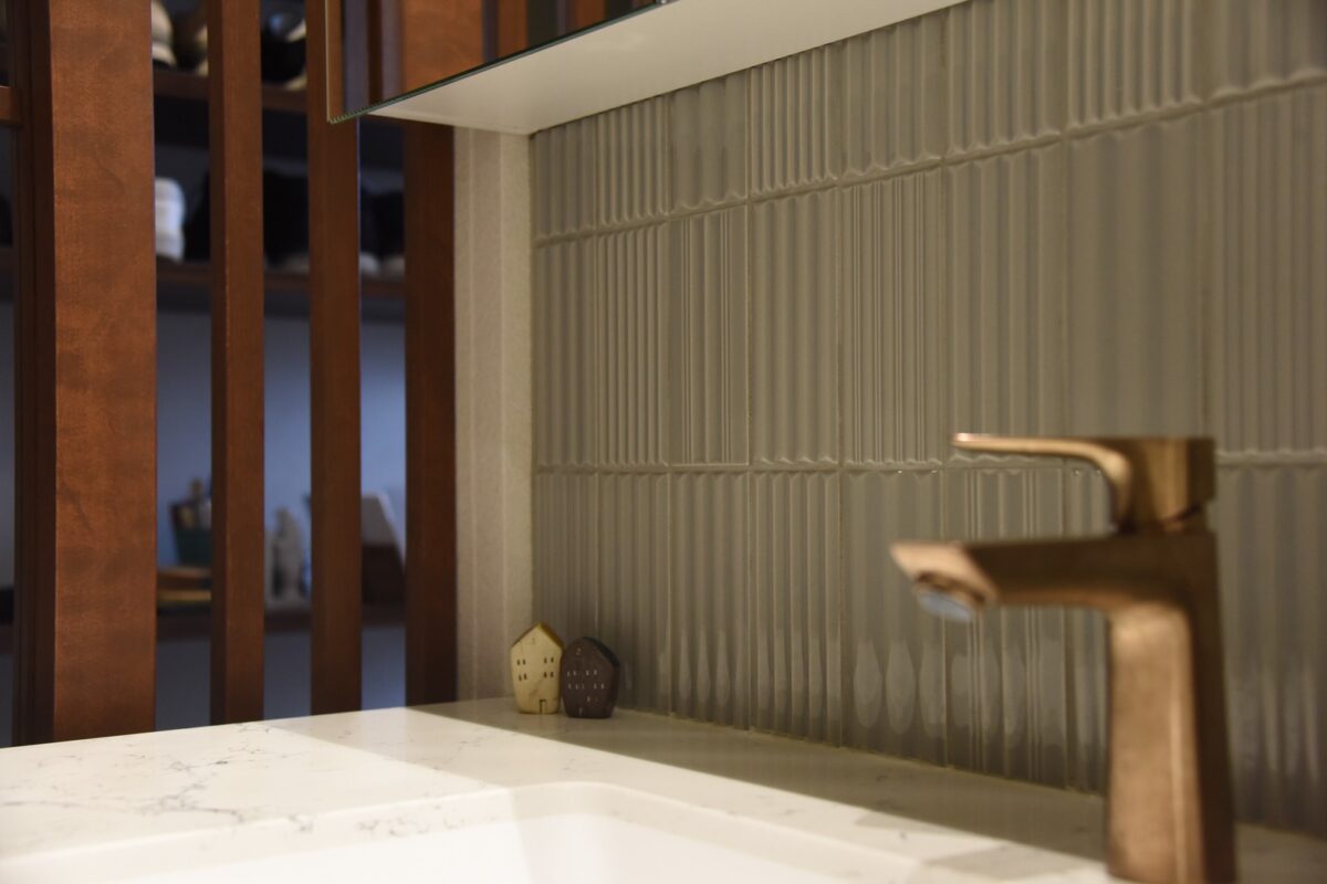 現場での実践的な工夫としては、キッチンの壁面に縦リブのグレージュの細いタイルを貼って質感をプラスするのも効果的です。