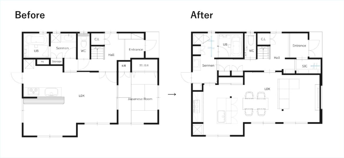 今回ご紹介するのは、在来木造の戸建住宅における 1階・2階全面改装の施工事例です。 和室を洋室へ。LDKをひとつながりの空間に 1階は、もともと和室とリビングが分かれた間取りでしたが、 「和室を洋室に変更し、LDKを一体感のある空間にしたい」 というご要望をいただきました。