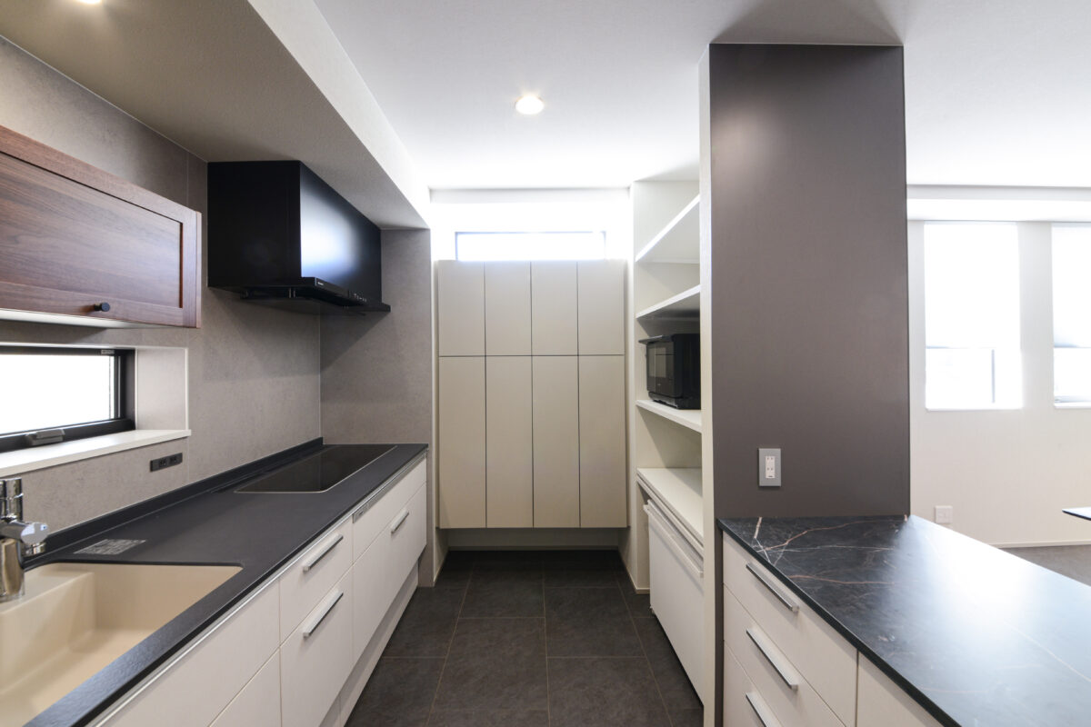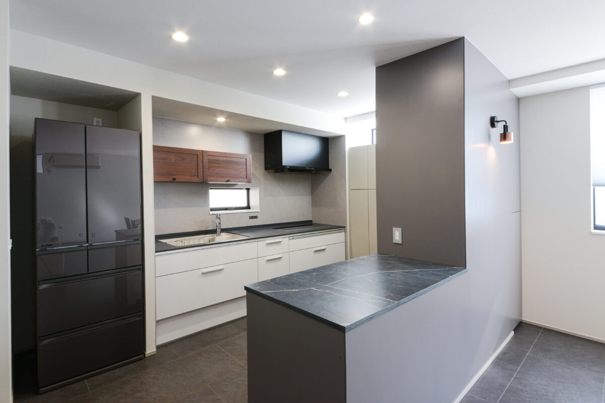 カウンターや家電収納まわりの壁面にはメラミン樹脂化粧合板を使用し、グレートーンで統一。