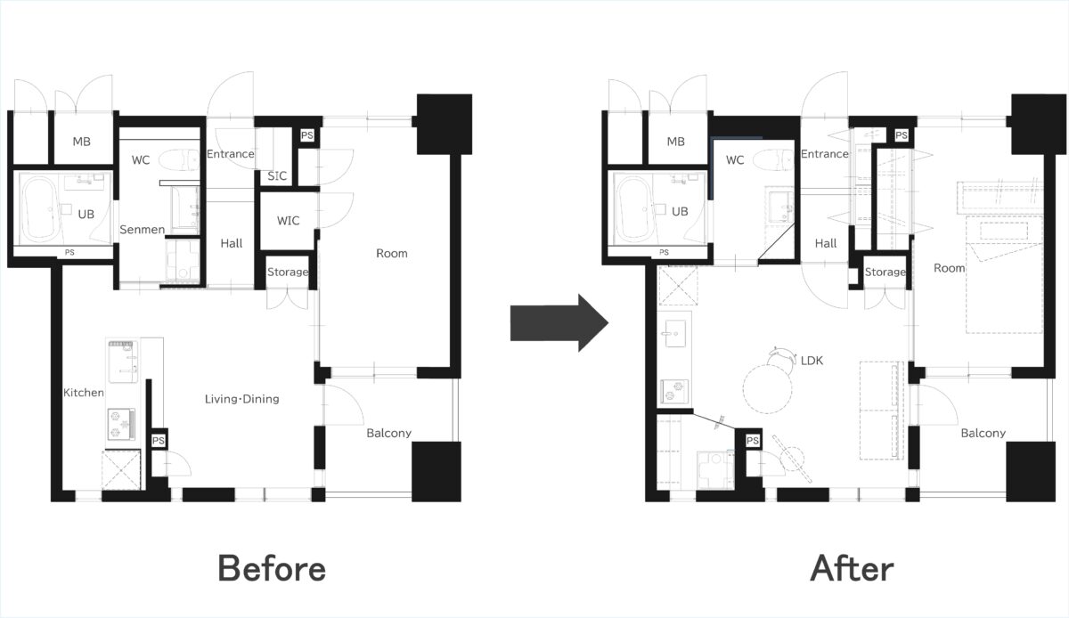 1LDKを広々と機能美を纏った空間へ